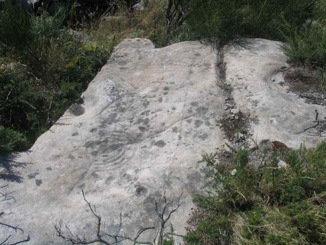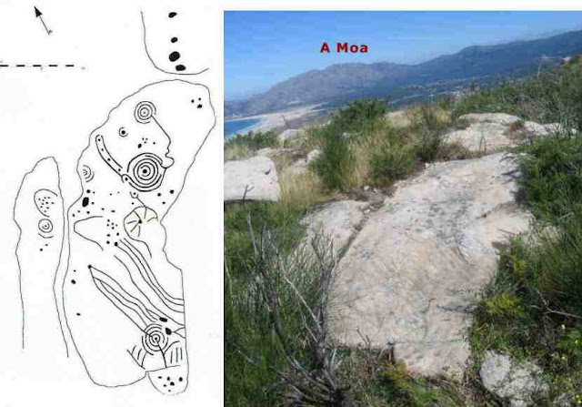 Los grabados que son muchos y notables, están en las montañas al Sur y al este del pueblo de campo Lameiro, que corresponden al curso mas encañonado del río, a su curso con meandros. Y entre ellos el que he indicado con un pequeño círculo, donde está la carballeira de San Xusto de Sacos y la muy excepcional roca de Laxe das Rodas