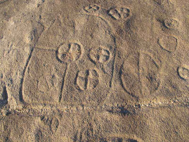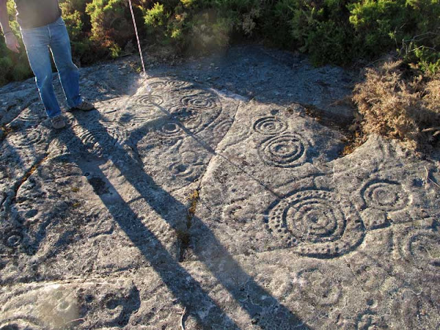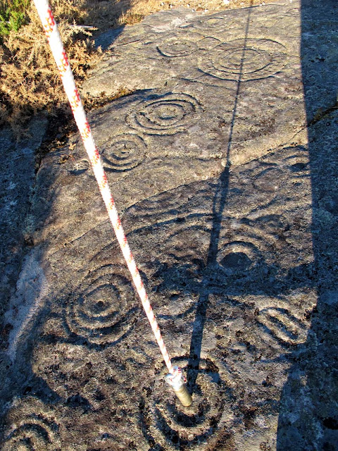 Una cara que ha estado iluminada todo el día y que en el equinocio , cuando el bastón provoca la linea equinocial.......... en 10 mn se apaga........ En el amanecer del solsticio de invierno la luz atraviesa el largo corredor de Newgrange e ilumina un grabado; en Mogor lo que se narra es la no-iluminación, el final del día .