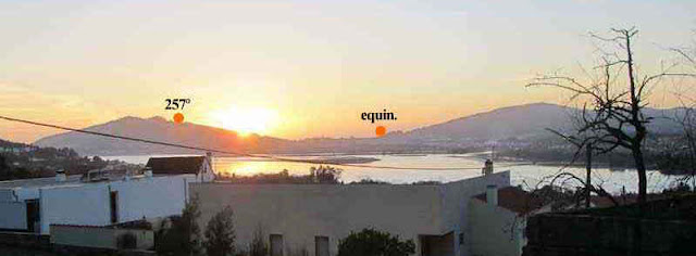 El 20 de marzo, Francisco Ameixeiras me acompañó a Mogor para fotografiar el alineamiento equinocial de Pedra dos Mouros, obtenido con plomada y con un palo simultaneamente.............. el alineamiento se produce entre las 20´20 y las 20´23; media hora antes de la puesta de sol. (267º era la demora verdadera medida por profesores de la Escuela Naval de Marín en el 2010)